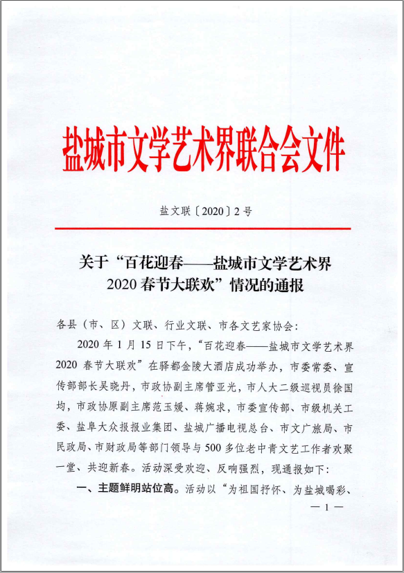 关于“百花迎春——盐城市文学艺术届2020春节大联欢”情况的通报